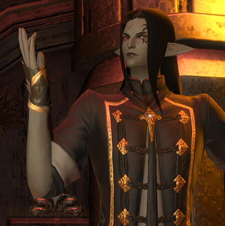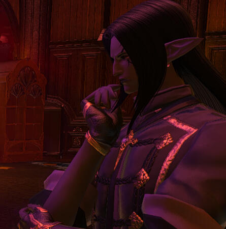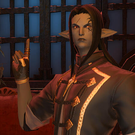 Jancre Dronant is a Duskwight Elezen, 26 years old. His notable features are his long ears (even for an Elezen, his ears are over average length), his near-constant scowl, the scar on his face, and his prosthetic right eye.He was previously entirely blind in his right eye, owing to an incident in his childhood involving a knife fight and a complete lack of proper wound care. A black and red robotic prosthetic eye has replaced it, returning his full vision to him. He still has the scar from the old wound, however.He tries to spend as much of his free time as possible with his husband, Soro'zi, or his chocobo, Plufon. He trained Plufon (and Soro'zi's chocobo, Suiz) himself; he will openly confess that he loves chocobos, and though he's had very little formal training in their care, he has a natural affinity for the horsebirds. He tends to treat them more like household pets than he probably should, though, often sneaking them treats and letting them barge past him as they please.